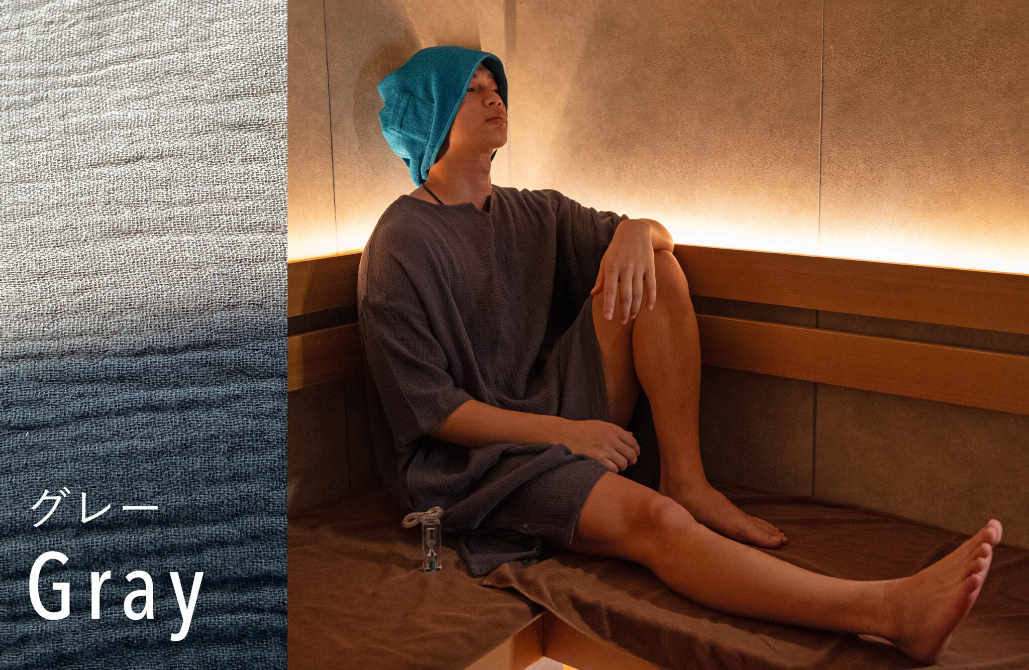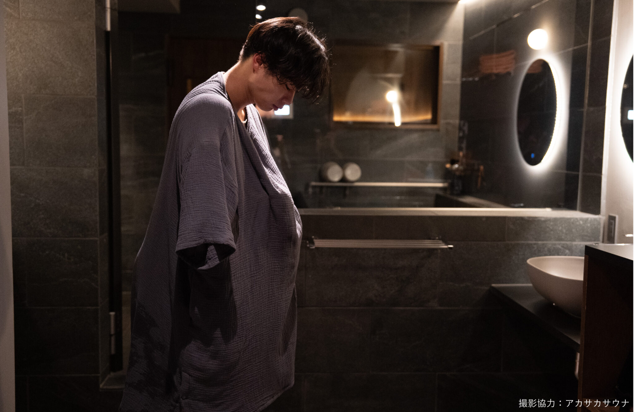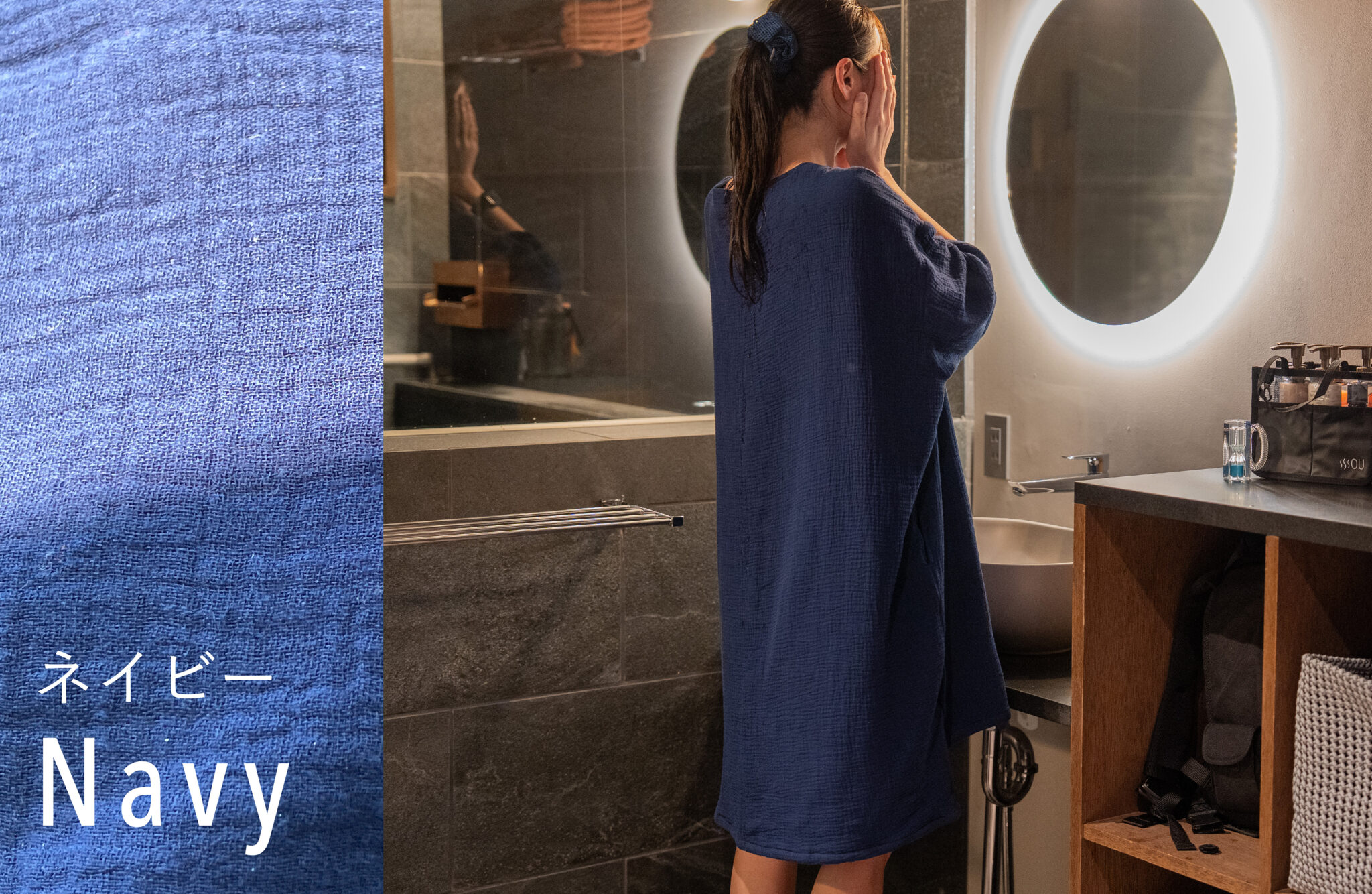 サウナ・お風呂上りから、パジャマやお洋服を着るまでの時間をつなぐ「湯上がりポンチョ」。 ガーゼ素材なので、濡れた素肌に着ても、やさしく身体を包みながら水分を吸収。