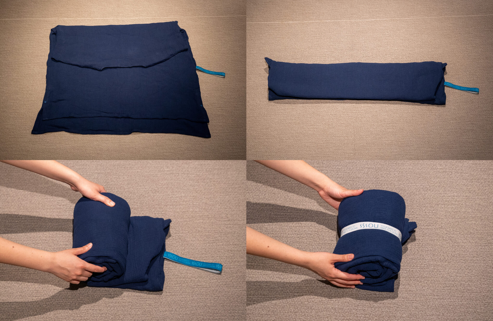ポケットの中に隠れているゴムバンドを使って、くるくるっと簡単に束ねられます!