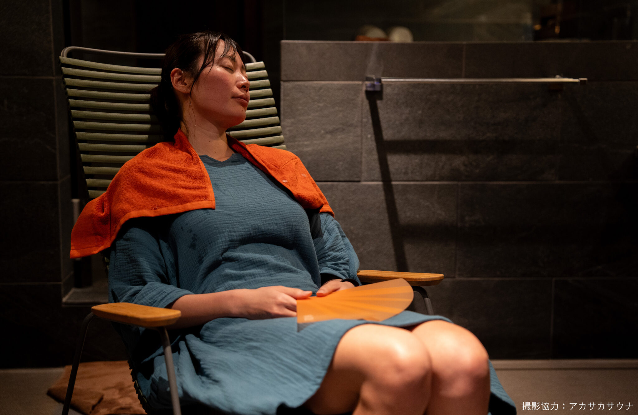 実際にサウナでポンチョのサンプル品を使用していただき、使用感をヒアリングし、商品開発に取り入れさせていただきました。